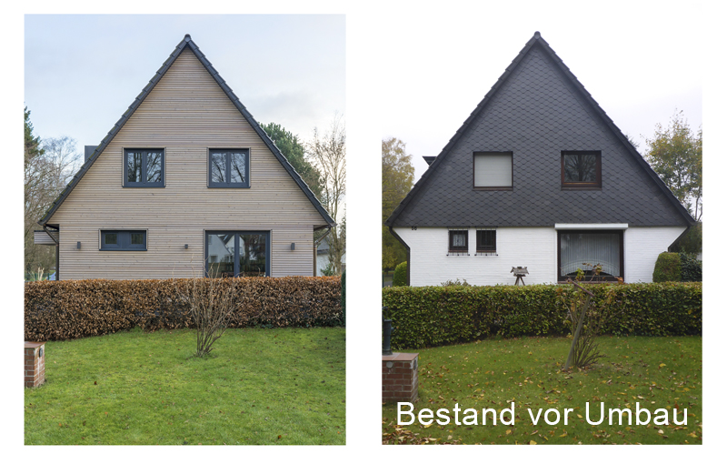 Nachhaltigkeits- und Umweltaspekte waren den Bauherren bei der Baumaßnahme ebenso wichtig wie eine moderne Außendarstellung, die sich dennoch in die Umgebung des Siedlungsgebietes harmonisch einfügt. Die Vorhangfassade aus geweißten Kalksandstein „Kippsteinen“ wurde abgebrochen und neu gedämmt, sowie mit einer hinterlüfteten Rhombusschalung aus sibirischer Lärche versehen. Die Eingangssituation wurde dabei komplett neu gestaltet und mit einem Vordach ergänzt. Alle Fenster wurden ausgetauscht und mit versteckten Rollädenkästen versehen. Das Dach des Hauses konnte erhalten werden und wurde mit einer neuen Blechverkleidung der Gaube optisch aufgewertet.